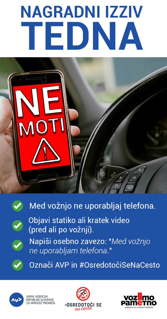 Ta teden se zavestno odloči, da med vožnjo ne uporabljaš telefona in sodeluj v nagradnem izzivu – enega izmed sodelujočih bo AVP nagradila s praktično nagrado (nahrbtnik) 🎁