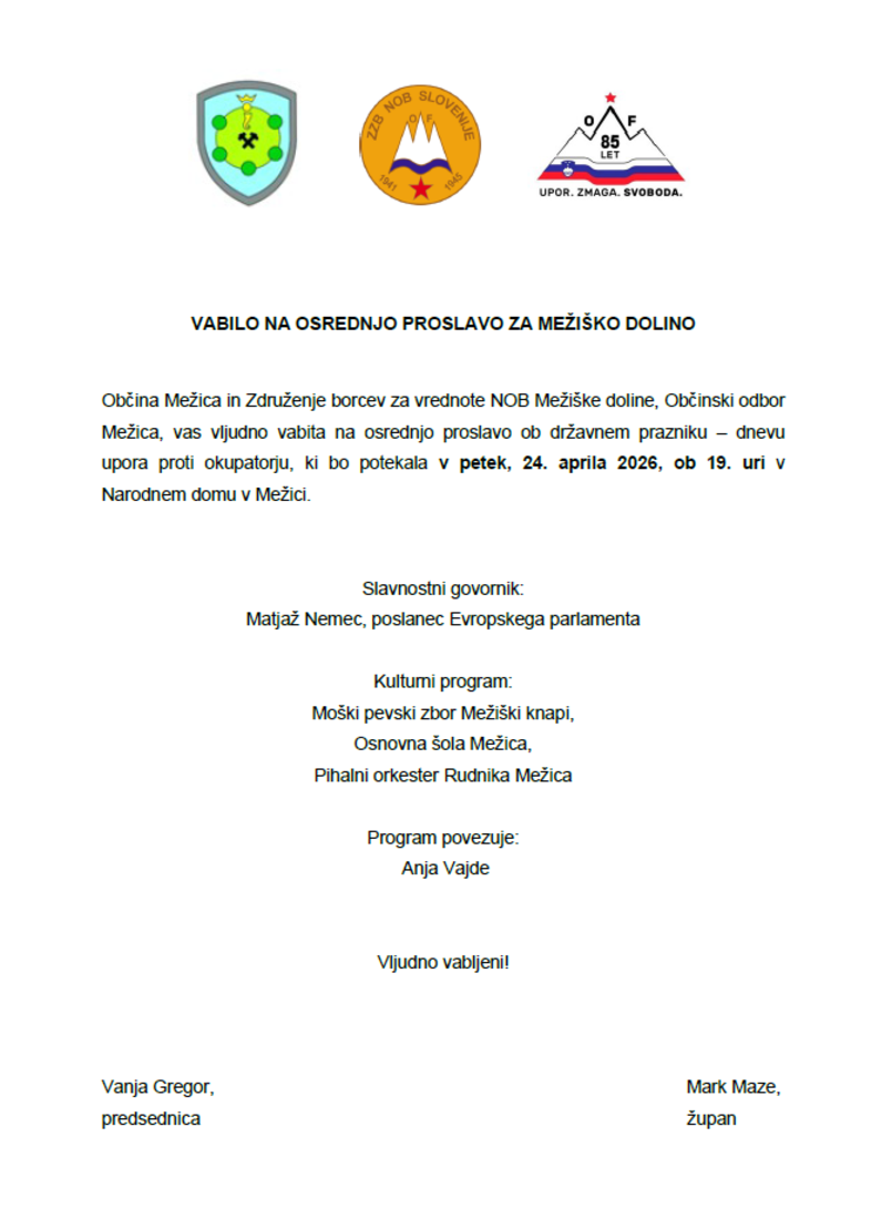 Občina Mežica in Združenje borcev za vrednote NOB Mežiške doline, Občinski odbor Mežica, vas vljudno vabita na osrednjo proslavo ob državnem prazniku – dnevu upora proti okupatorju, ki bo potekala v petek, 24. aprila 2026, ob 19. uri v Narodnem domu v Mežici.