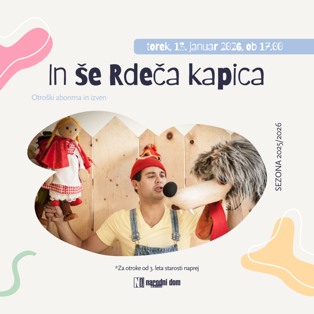🧺 Rdeča kapica tokrat prinaša nekoliko drugačno zgodbo. Ko sta Kapica in babica že rešeni, se deklica znova odpravi skozi gozd – a zdaj je strah pred volkom še večji. Skupaj z otroki, lutkami in glasbo bomo raziskovali, ali je volk res tako hudoben, zakaj ga pravljice vedno postavljajo v vlogo zlobneža in ali se lahko zgodba konča tudi drugače. Predvsem pa se bomo ob tem imenitno zabavali.