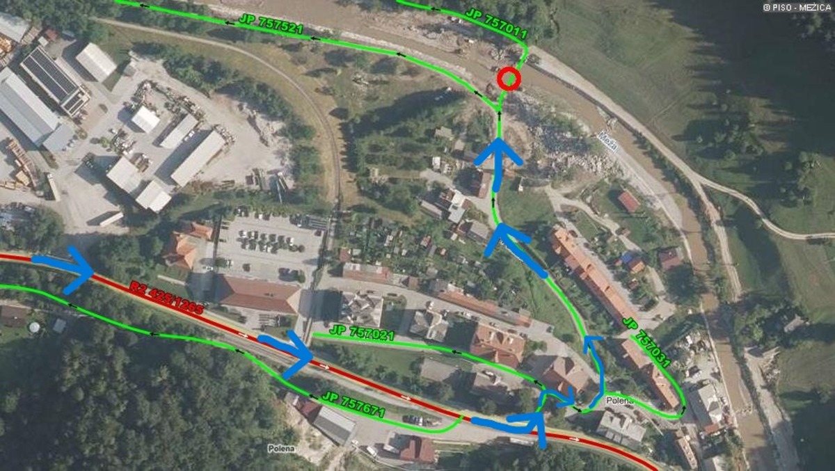 Dostop do mostu bo možen po državni cesti R2 425/1265 do naselja Polena- levo na JP 757021 (Polena – za bloki) in nadalje takoj desno na JP 757011 (Kopališka pot – Polena) - do mostu Orešnik (grafika v priponki)