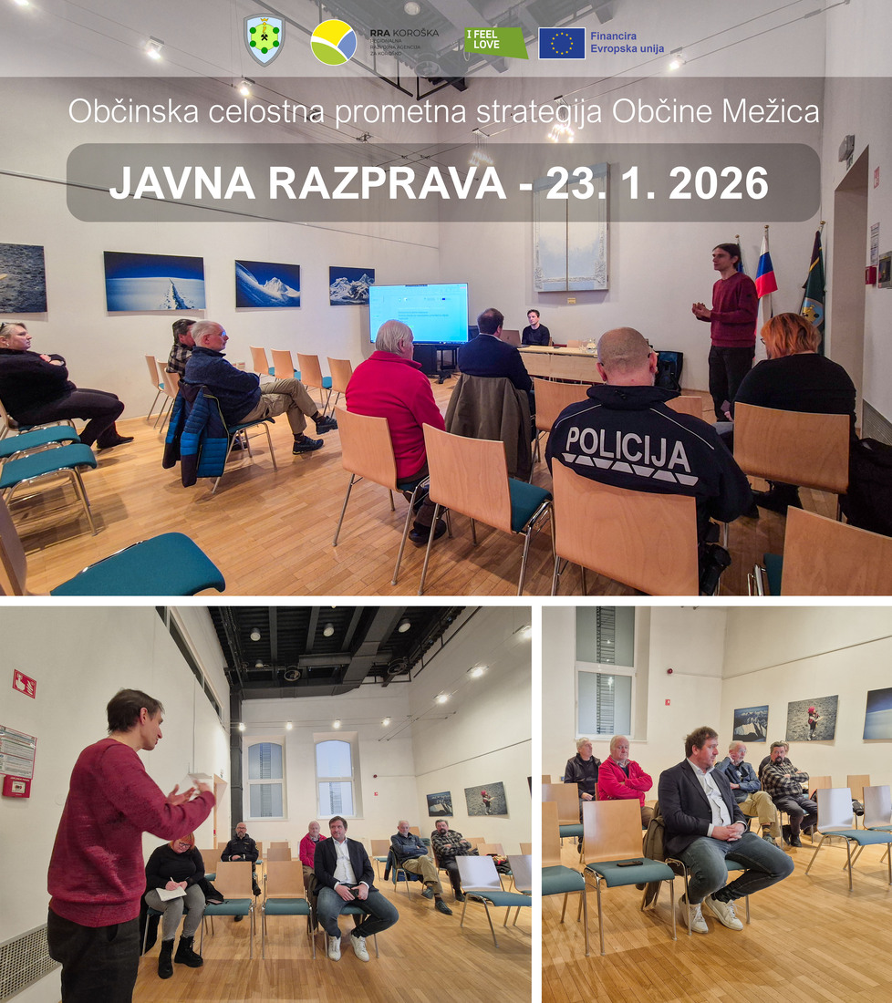 Občina Mežica je skupaj z izdelovalcem OCPS RRA Koroška d.o.o. 22. 1. 2026 izvedla delavnico in javno razpravo, na kateri so bili predstavljeni rezultati analize obstoječega stanja. Skupaj s udeleženci smo opredelili tudi ključne izzive, priložnosti, prioritete in ciljne vrednosti. Na podlagi prioritetnih ciljev OCPS so bila izdelana, predstavljena in potrjena strateška vodila ter načrt spremljanja kazalnikov. Strateška vodila predstavljajo podlago za odločanje o najprimernejših rešitvah/ukrepih pri posameznih prometnih stebrih: Celostno prometno načrtovanje, hoja, kolesarjenje, javni potniški promet in avtomobilski promet. V participativnem procesu so bili kot prioritetni cilji opredeljeni: