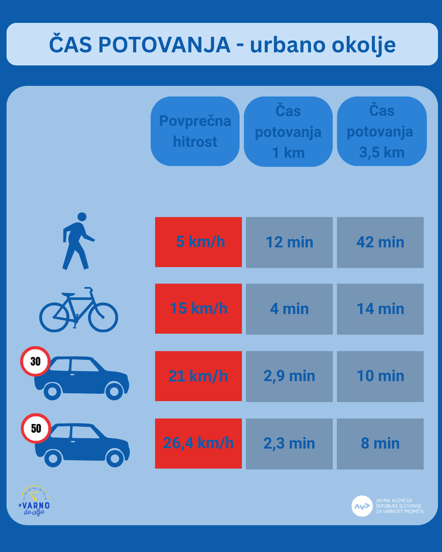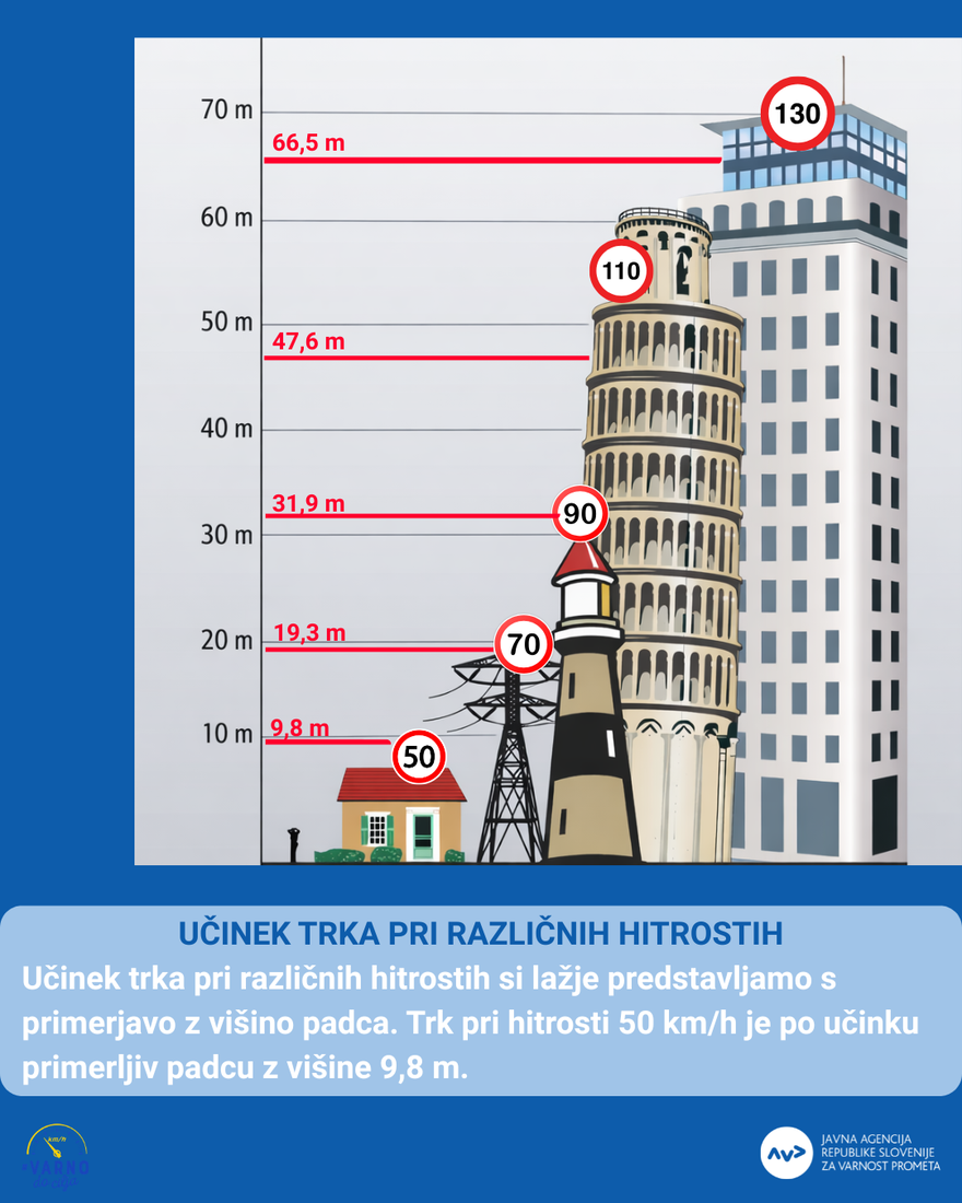 Veliko voznikov podcenjuje vpliv hitrosti, vendar so zakonitosti fizike neizprosne. Že pri hitrosti 50 km/h znaša zavorna pot več kot 13 metrov. Če dodamo še reakcijski čas (utrujenost, neosredotočenost), se razdalja hitro podvoji. Posledice trkov pri visokih hitrostih so veliko hujše: trk v pešca pri 50 km/h je primerljiv s padcem z višine skoraj 10 m in ima lahko usodne posledice. Pri trčenju vozila s hitrostjo 30 km/h je tveganje za smrt pešca 10 %, pri 50 km/h že okoli 80 %, pri 60 km/h pa naraste na 95 %. Tudi majhno prilagajanje hitrosti bistveno prispeva k varnosti vseh udeležencev v prometu: znižanje povprečne hitrosti v naselju za 1 km/h lahko pomeni približno 4 % manj prometnih nesreč.